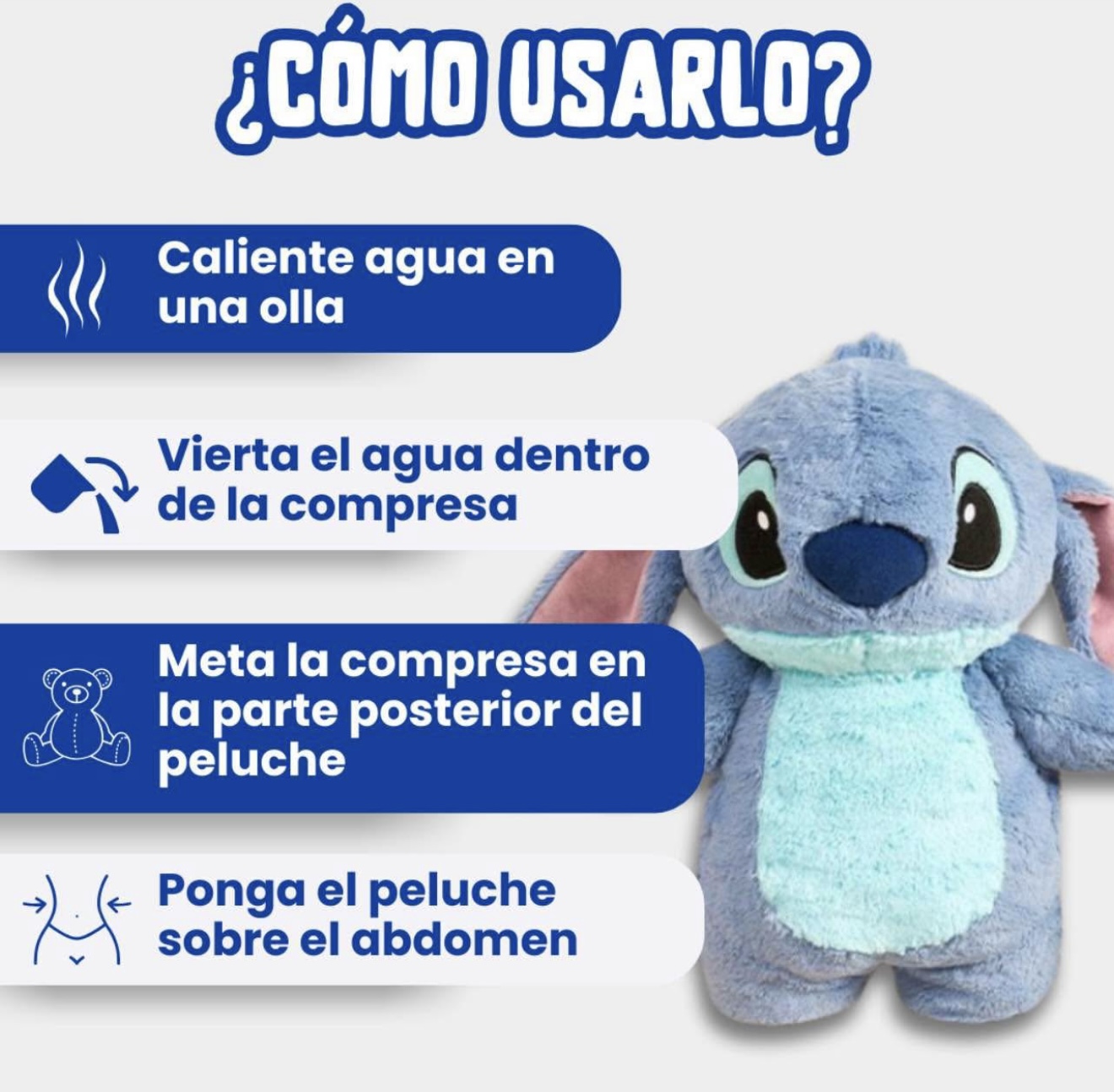 Utiliza el peluche para aplicar calor en la zona deseada.