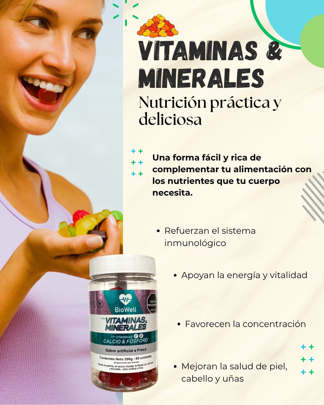 Las gomas de vitaminas y minerales BioWell están diseñadas para complementar la alimentación diaria de manera práctica, deliciosa y fácil de consumir. Su fórmula aporta micronutrientes esenciales que contribuyen al bienestar general, la energía y el funcionamiento adecuado del organismo.