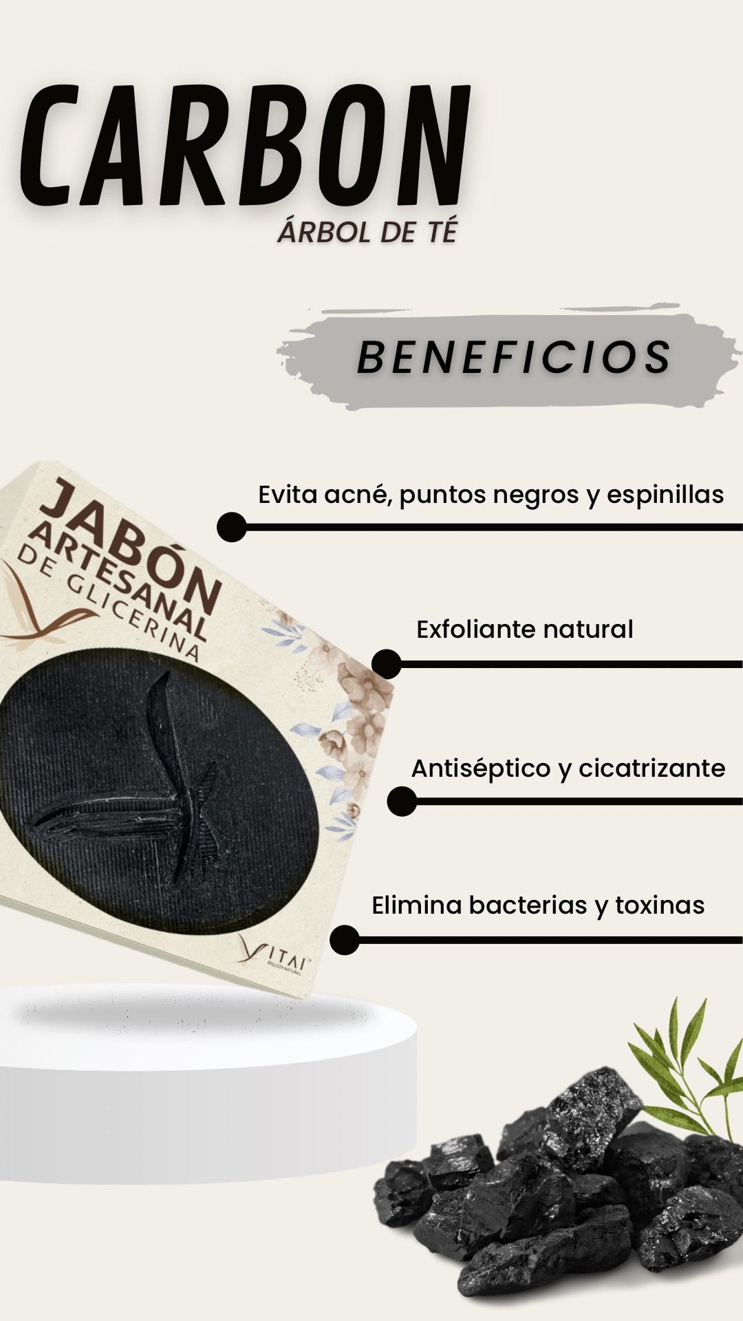 Este jabón artesanal combina la suavidad de la glicerina natural con el poder purificante del carbón activado, un ingrediente conocido por su capacidad de absorber impurezas, grasa, bacterias y toxinas de la piel.
