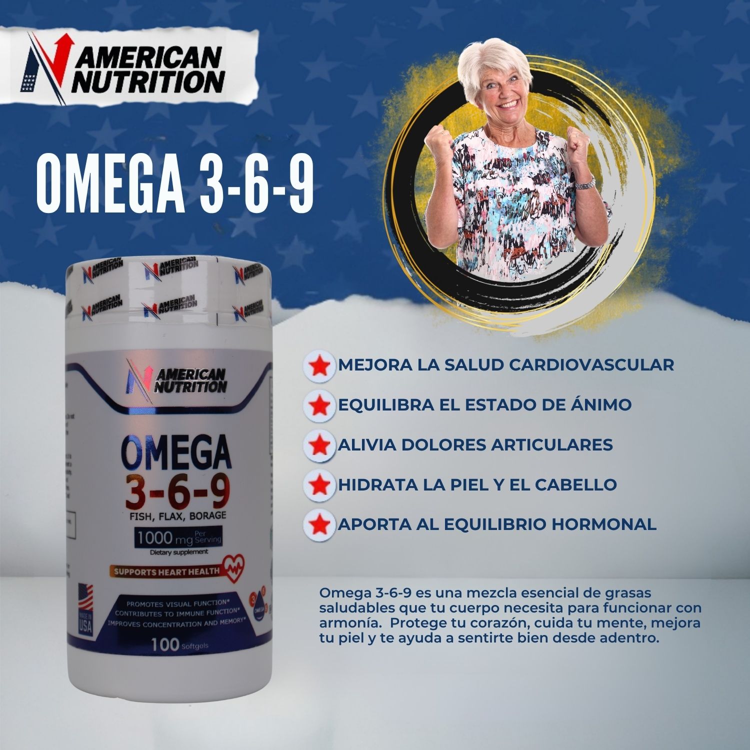 Omega 3 6 9 American NutritionF rmula balanceada que combina los beneficios del omega 3 omega 6 y omega 9 provenientes de aceites de pescado linaza y borraja Esta mezcla de cidos grasos esenciales ayuda a mantener el coraz n sano mejorar el estado de nimo y promover la salud integral desde adentro hacia afuera Beneficios principales Contribuye a la salud cardiovascular y circulaci n Ayuda a equilibrar el estado de nimo y la concentraci n Alivia dolores e inflamaciones articulares Favorece la hidrataci n y elasticidad de la piel y el cabello Apoya el equilibrio hormonal en hombres y mujeres Presentaci n 100 c psulas blandas de 1000 mg Ideal para personas que desean cuidar su salud cardiovascular articular y mantener una apariencia saludable y llena de vitalidad Una mezcla esencial de grasas buenas para cuidar tu coraz n tu mente y tu bienestar general